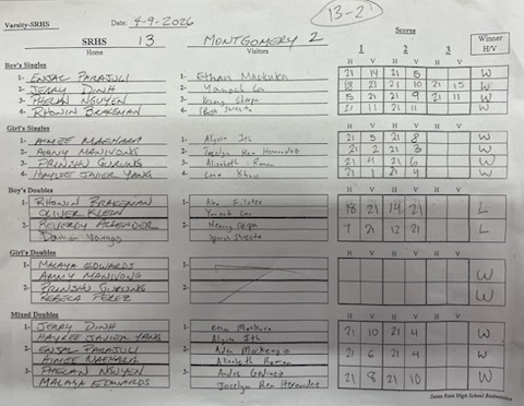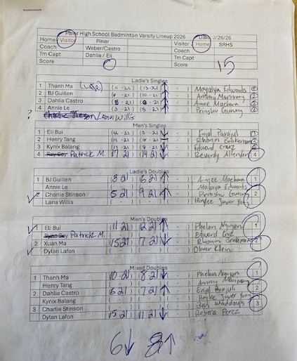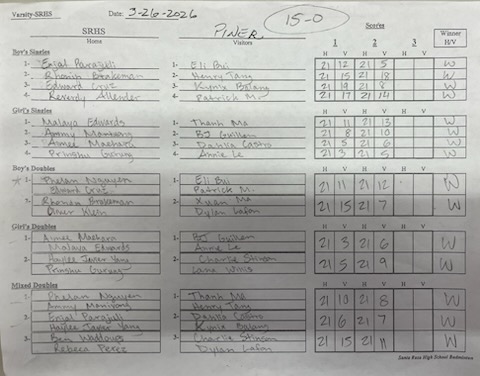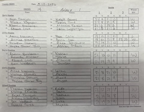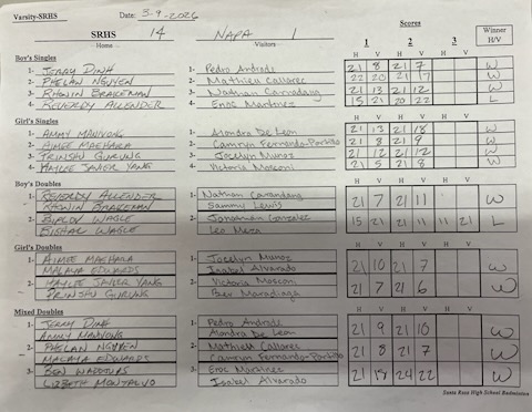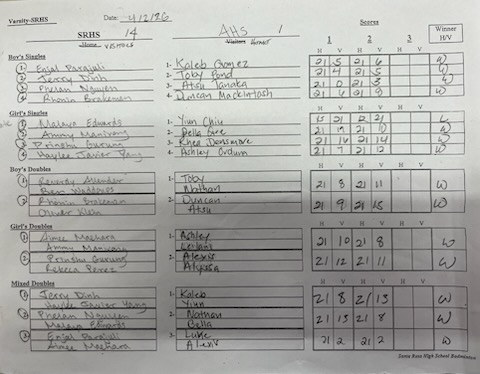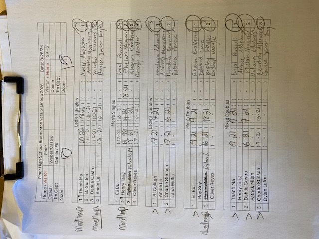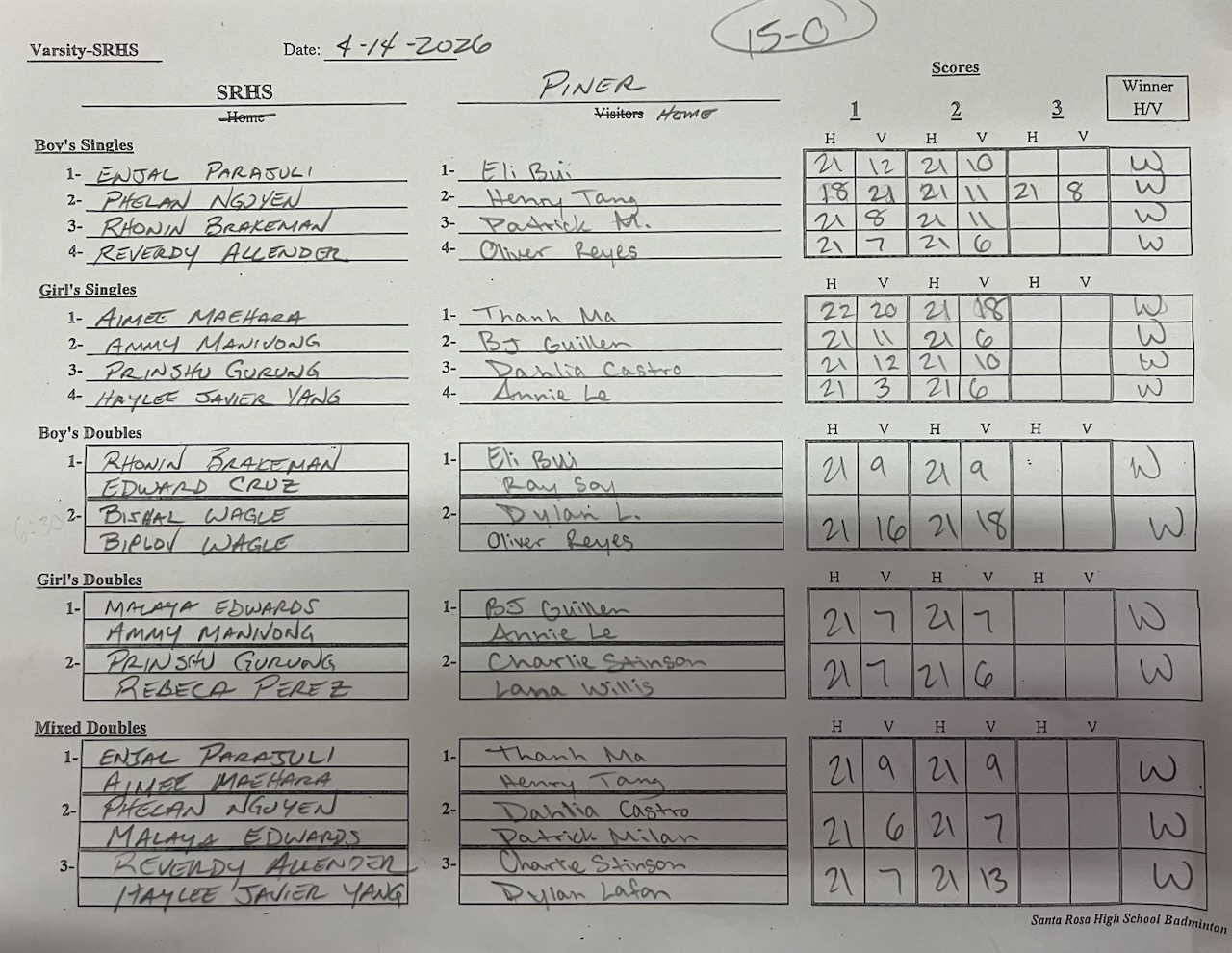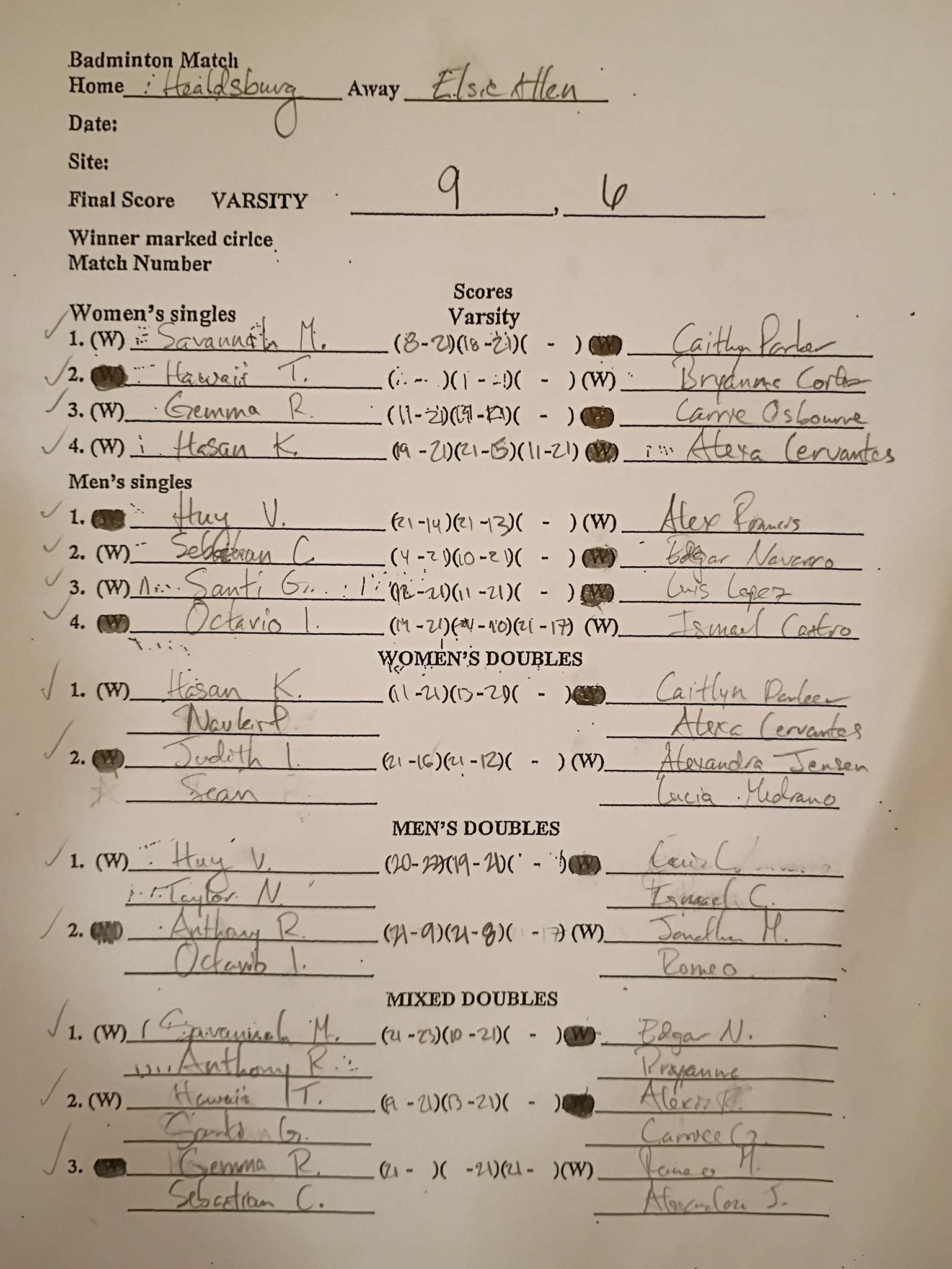 Both coaches at each match please send in results (all matches including JV and exhibition) directly after meets. Any format is fine- email/mms /hardcopy dropped at Stan's house or even FAX if you really want to (ask if you don't know where). Easiest (probably): point your phone at the final scoresheet, snap a picture, and email or text it to me (stan@worldbadminton.com). Note that most matches start at 4:30 and most gyms do not open before 3:30. Healdsburg: gym opens at 4:00 and matches start at 4:30. Please do NOT arrive earlier as school will still be in session. RCP: gym opens 5:30 and matches start at 6.