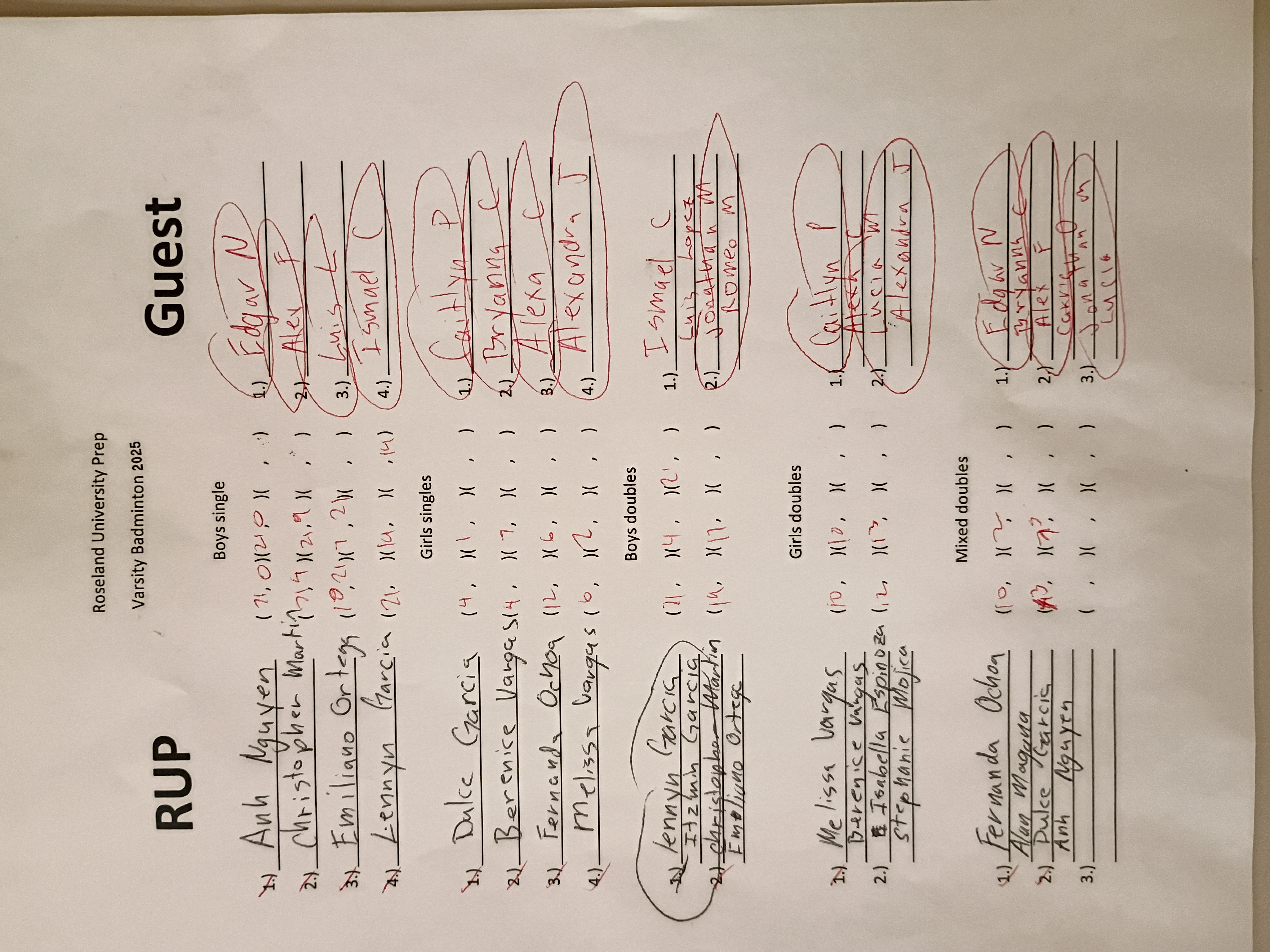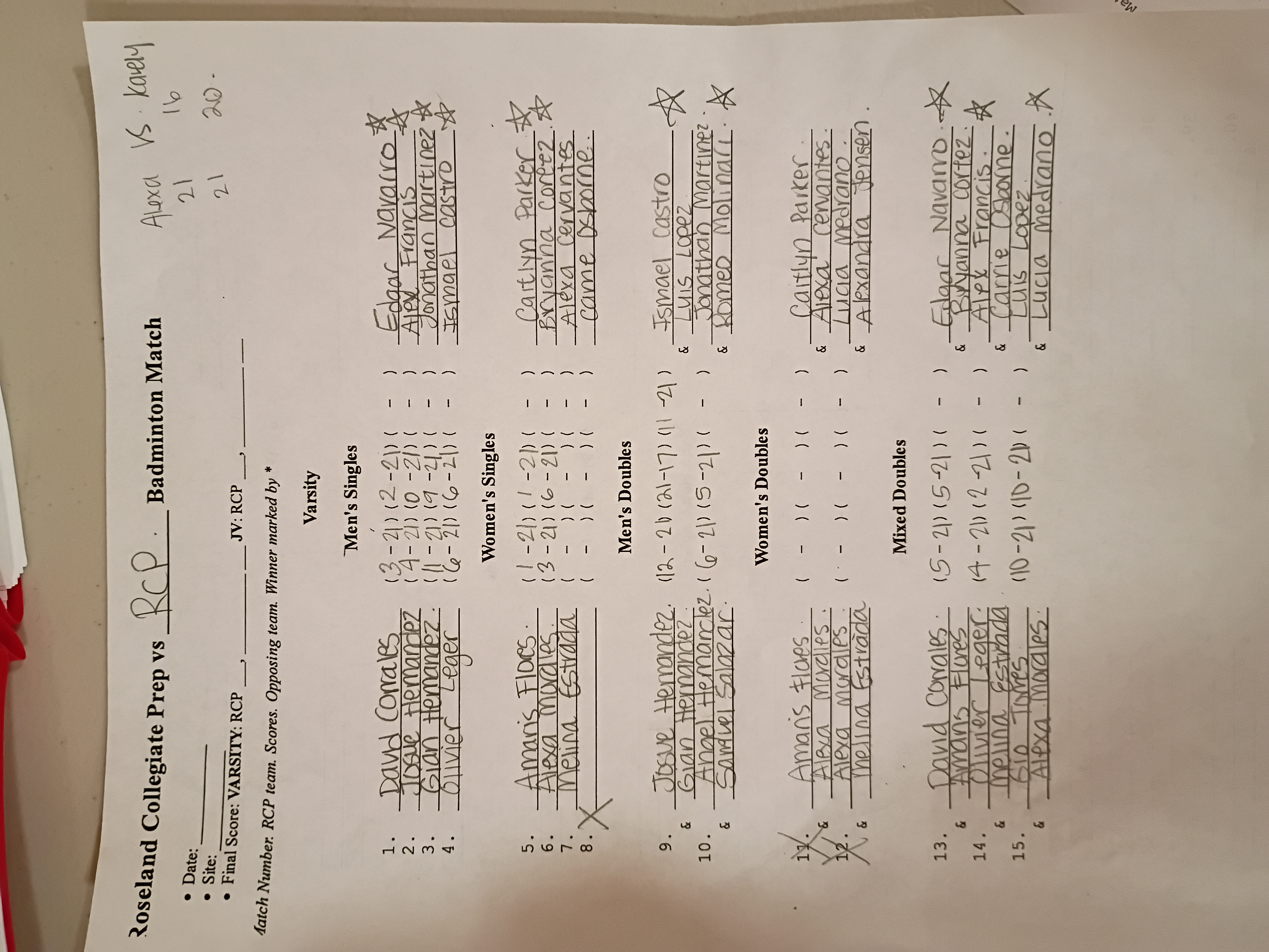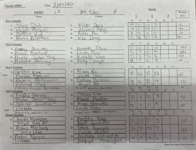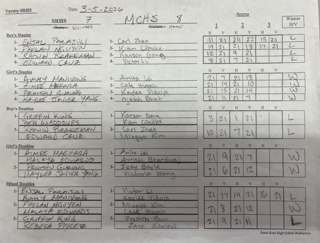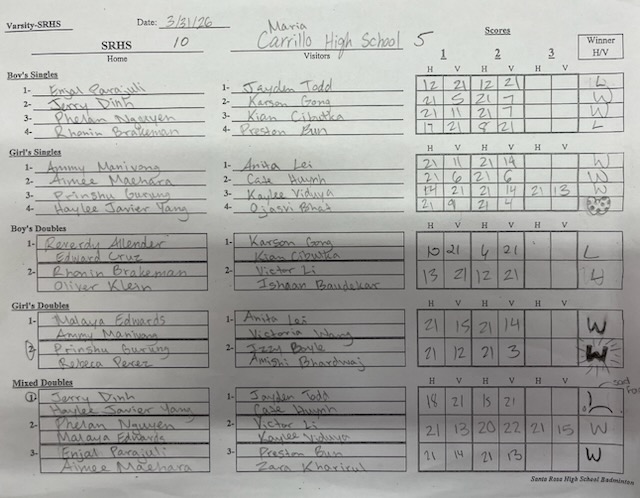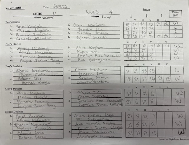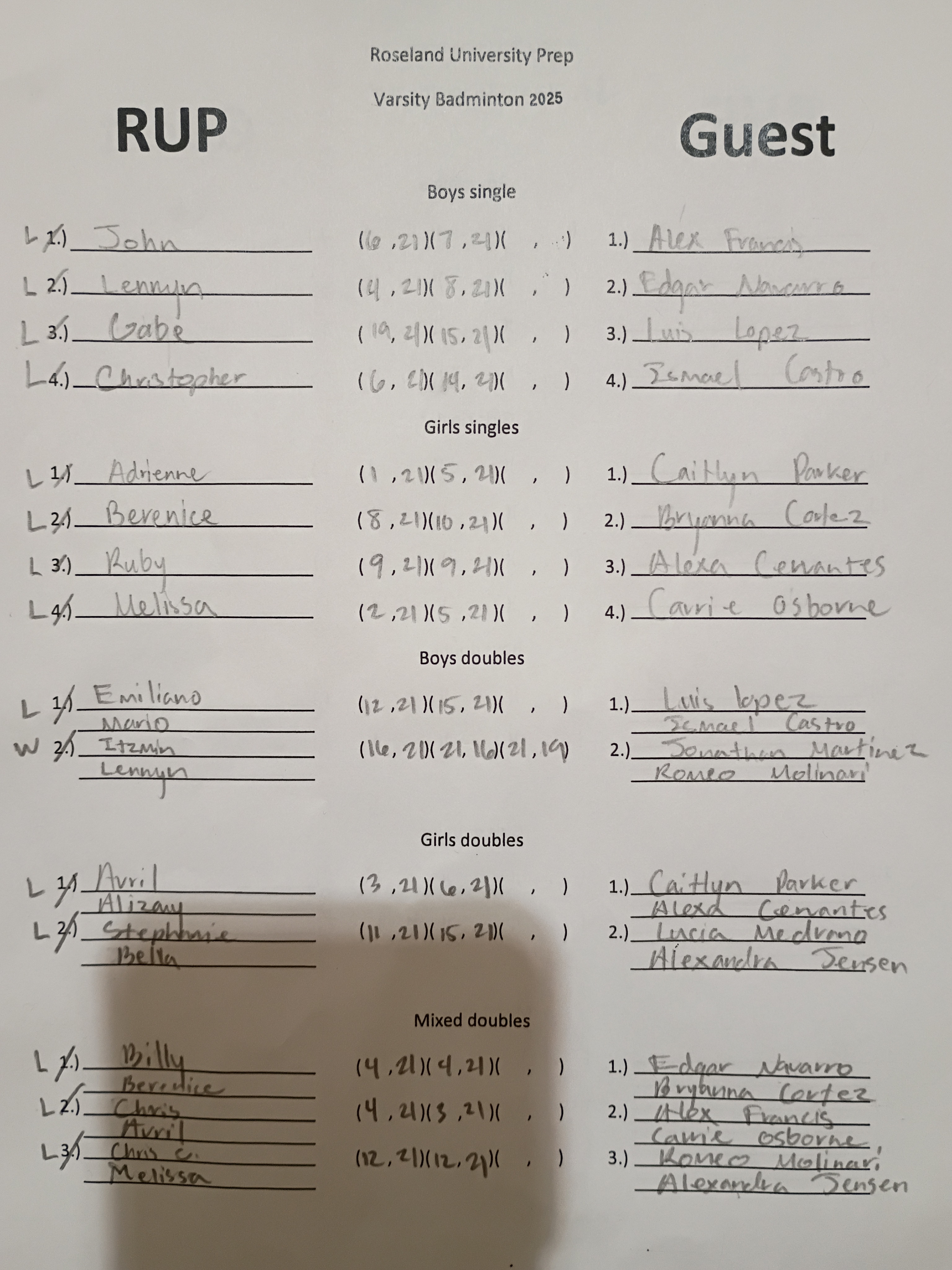 Both coaches at each match please send in results (all matches including JV and exhibition) directly after meets. Any format is fine- email/mms /hardcopy dropped at Stan's house or even FAX if you really want to (ask if you don't know where). Easiest (probably): point your phone at the final scoresheet, snap a picture, and email or text it to me (stan@worldbadminton.com). Note that most matches start at 4:30 and most gyms do not open before 3:30. Healdsburg: gym opens at 4:00 and matches start at 4:30. Please do NOT arrive earlier as school will still be in session. RCP: gym opens 5:30 and matches start at 6.