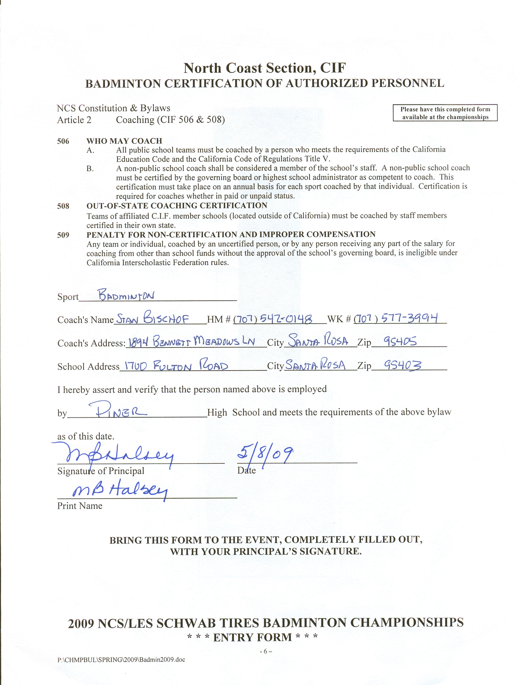StanBischof_120x160.jpg (3349 bytes) I have been playing competitive badminton since 1979 and have been coaching Badminton since the early 80's. I coached Piner High's badminton team from 1993-2011. In 2013 I moved to Elsie Allen High, then in 2018 moved to RUP and in 2019 decided that my next challenge would be Healdsburg High. Starting in 2021 I added Montgomery High to my perview. I also have privately coached juniors since the early 80's. Aside from a brief foray or two into Yonex (Yoneyama wood, Blacken, Cab 10) I'm a lifelong Carlton user, starting from the 3.9, including pretty much every model such as the ceramics and the early high tensions, and these days using Rasmussen Airblade.